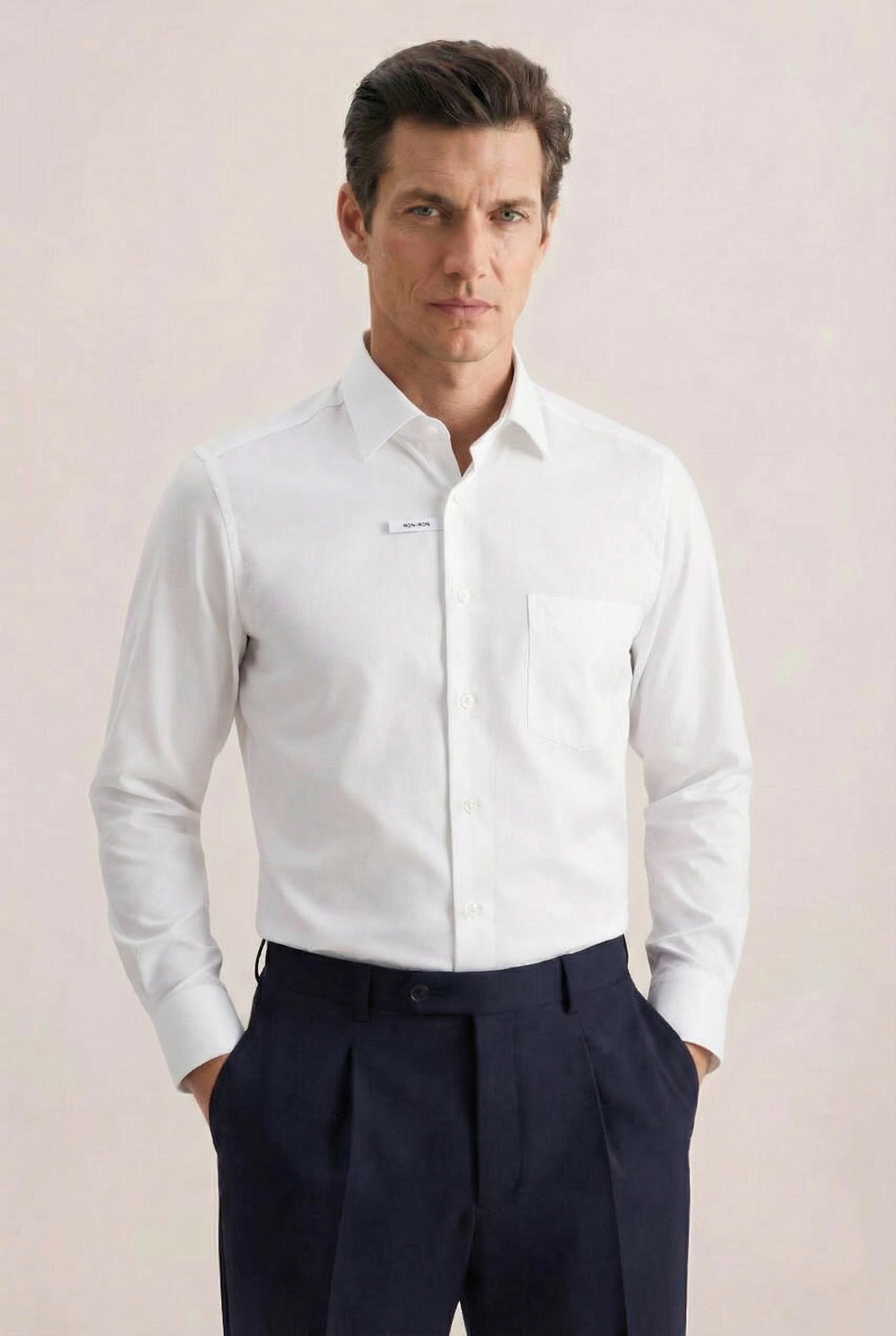 • Прямой силуэт, Классический воротник, Классический (на пуговице), Однотонный, Белый